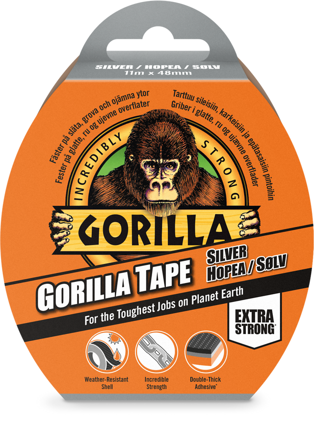 Det finns ingen tejp som liknar den här. Gorilla Tape är den extra-tuffa tejpen för inom- och utomhusjobb. Den är stark och förstärkt, men kan ändå dras bort för hand. Tejpen fäster på grova, ojämna, oförsonliga ytor som trä, sten, puts, gips, tegel och mycket mer. Gorilla Tejp har en tålig yta som klarar alla väder. Ytan skapar en tät barriär som står emot fukt, UV-strålar och extrema temperaturer. Baksidan på tejpen är förstärkt med extra tät vävnad. Slutligen är limmet på tejpen dubbelt så tjockt som på traditionella silvertejper och fyller gap på grova, ojämna ytor och ger ett superstarkt grepp.