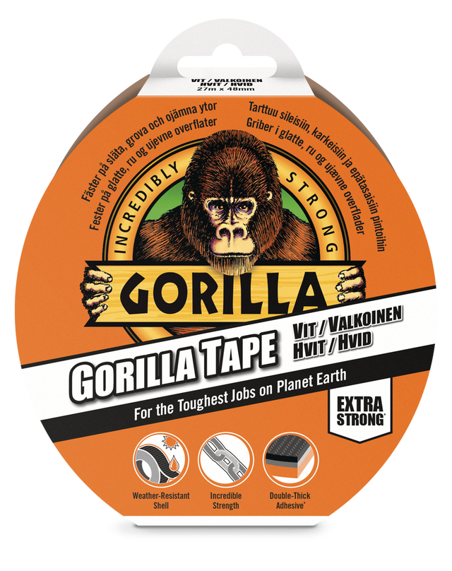 "Det finns ingen tejp som liknar den här. Gorilla Tape är den extra-tuffa tejpen för inom- och utomhusjobb. Den är stark och förstärkt, men kan ändå dras bort för hand. Tejpen fäster på grova, ojämna, oförsonliga ytor som trä, sten, puts, gips, tegel och mycket mer.