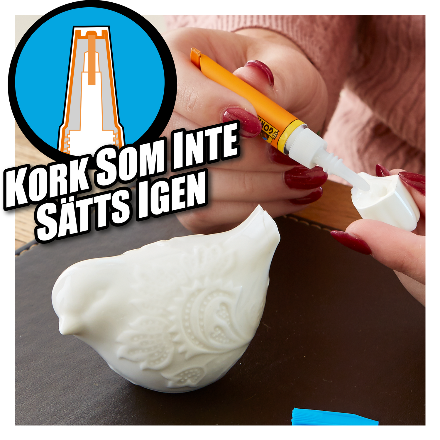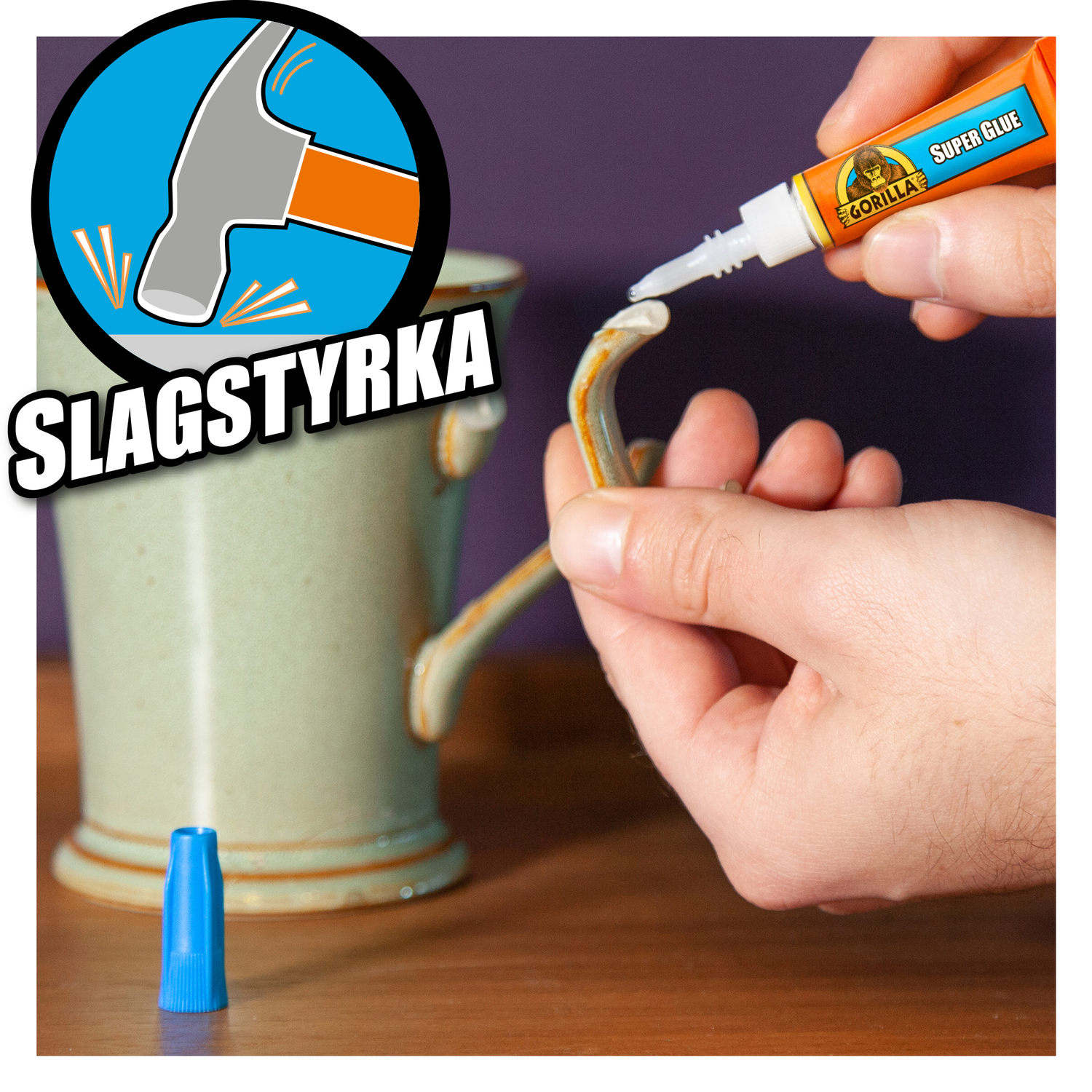 Gorilla Super Glue är superlimmet som verkligen håller och stelnar på endast 10 sekunder. Limmet har små gummipartiklar i sig som innebär ännu lägre risk för att limningen spricker vid påverkan och gör att dina reparationer tål mer. Vi kallar det Impact-Tough ™. En flaska Gorilla Superlim håller gummi, papper, trä, läder, metall, keramik och mycket annat ordentligt på plats. Flaskans munstycke har ett metallstift inbyggt vilket förhindrar att munstycket sätts igen.