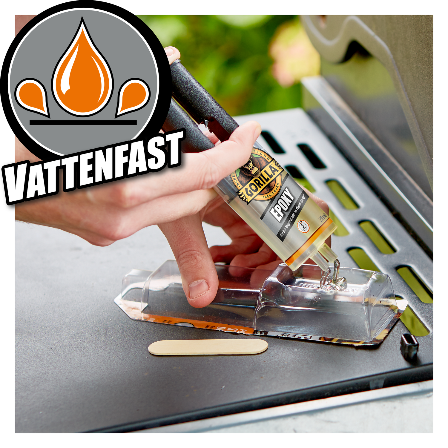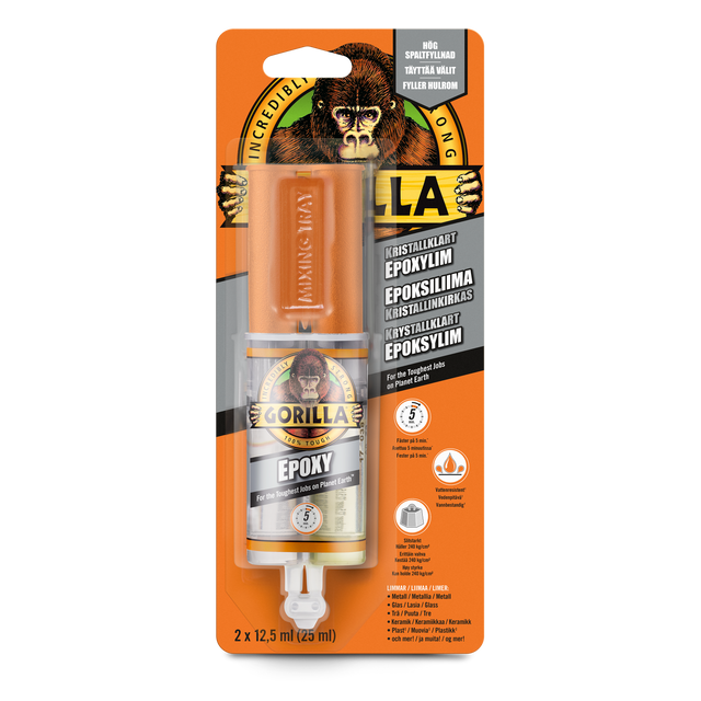 Tvåkomponentsformulan i Gorilla Epoxy härdar på 5 minuter. Limmar plast, trä, glas, metall, keramik och sten och mycket mer.