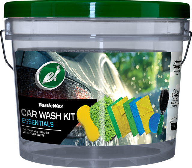 Turtle Wax Tillbehörshink är en 11 L tvätthink med lock, innehållande de mest nödvändiga tillbehören som behövs för att tvätta och vaxa bilen.